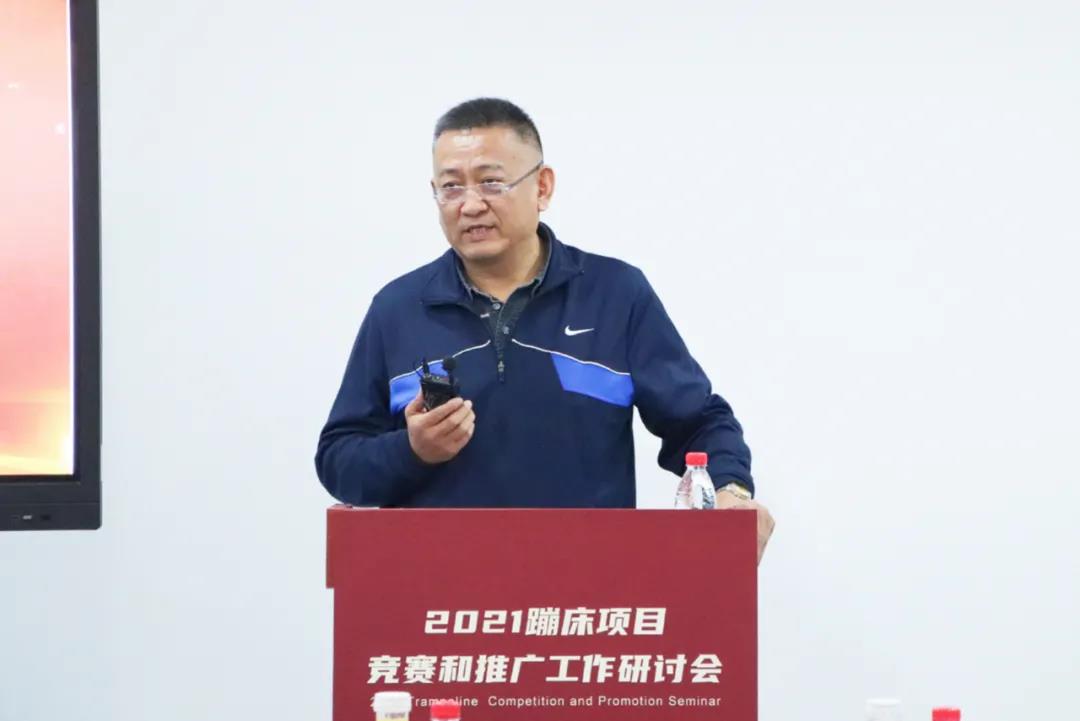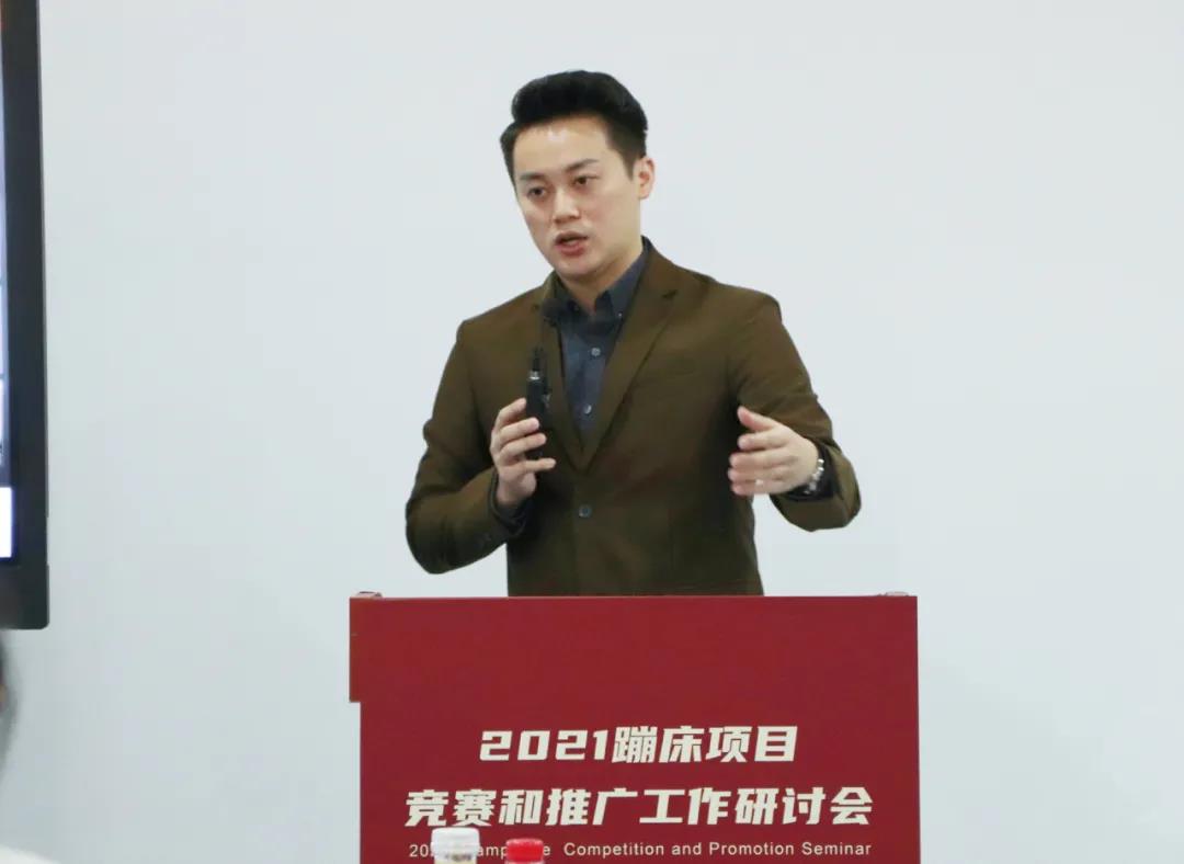 研讨会上,国家体育总局体操运动管理中心蹦床部主任贾伍华针对体操中心2020年工作实践与2021年重点工作做出详细阐述。他指出2020年,服务和保障东京奥运会备战工作仍是中心的重点业务,在疫情下排除困难从赛事组织、科研保障、裁判管理、信息服务等方面主动出击,满足队伍的备战需求,为国家队竞技水平的提升提供了多重保障。2020年体操中心在蹦床项目的竞赛组织方面也做出了很多切实有效的探索与实践,并于2020年6月正式下发《关于印发中国蹦床与技巧协会蹦床项目办赛指南、参赛指引的通知》,为新时期更好开展蹦床项目竞赛提供了依据。他强调,要推动蹦床项目科学有序高质量发展,也要认清当前项目推广过程中存在的问题,目前蹦床项目赛事与群众体育项目赛事发展差距还很大,2021年要全面提升蹦床赛事的现场感官体验,引入市场资源,与企业、俱乐部共同探索创新发展方式和竞赛产品、锻炼产品,将蹦床赛事推向更广泛受众。 在推进蹦床项目在全国落地推广方面,以大众蹦床技术等级体系和蹦床操项目为抓手,通过举办蹦床操赛事和蹦床通级赛,帮助省级、地市级蹦床协会和体育管理部门、教育管理部门发展蹦床项目和大众蹦床项目,促进地区蹦床项目的体教融合,并举行举办全国蹦床裁判技术加强培训班,培养更多的专业裁判人才,为高水平竞技队伍发现和输送人才奠定基础。
